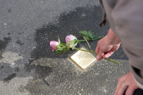 Besonders bemerkenswert war, dass sich erst am Abend zuvor eine Verwandte von Fritz Reinlein von sich aus meldete und spontan an der Verlegung am Vormittag und an der Abendveranstaltung teilnahm. Tief bewegt legte die Großcousine Frau Angelika Müller zusammen mit Herrn Dr. Mierau (Geschichtslehrer am RGW und Organisator der Verlegung) als Erste Rosen auf den frisch eingelassenen Stein.