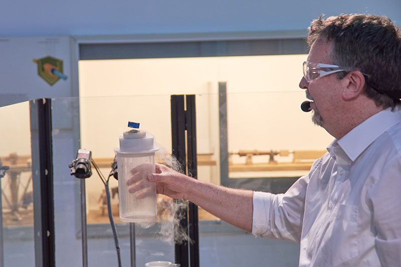 Bereits kurz nach dem Einchecken im Kerschensteiner Kolleg, welches über einen Gang direkt mit den Ausstellungsräumen des Deutschen Museums verbunden ist, erlebten die Teilnehmenden eindrucksvolle Experimente in der Physikabteilung. Peter Stoppel, wissenschaftlicher Mitarbeiter des Museums, begeisterte für sein Fach. Es zischte, brodelte und gezeigt wurden die erstaunlichen Eigenschaften des -196 °C kalten flüssigen Stickstoffs. Die Kältetechnik von Carl von Linde macht`s möglich!