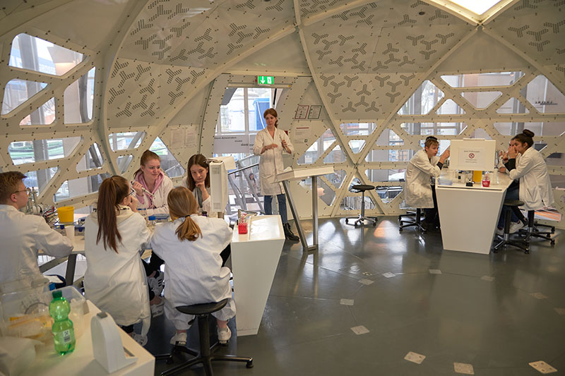 In einem „UFO“, das über der Ausstellung Nano- und Biotechnologie „schwebt“, konnten unsere Jungforscherinnen und -forscher am darauffolgenden Tag selbst Versuche durchführen, ihre eigene DNA isolieren und dabei den Umgang mit Pipette und anderen Laborgeräten aus der Molekularbiologie lernen. Dabei wurde nicht nur die alltägliche Arbeit der Forscherinnen und -forscher im Labor nachvollziehbar, sondern man erfuhr auch Wissenswertes zur Zellbiologie, Vererbung und Gentechnik.