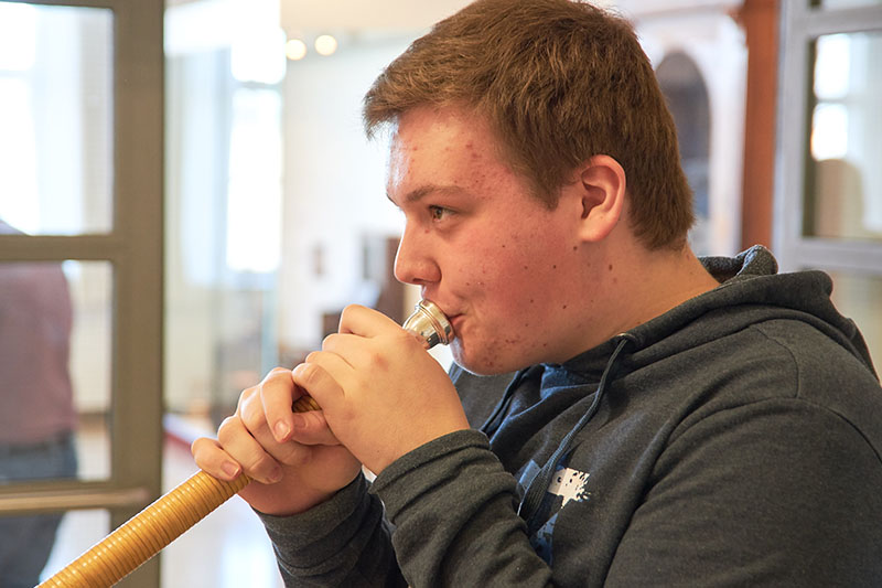 Für einen harmonischen Ausklang der gelungenen Studienfahrt sorgte Christian Lang bei einer Experimentalführung durch die Ableitung der Musikautomaten. Vom Nachbau einer germanischen Lure bis zum Synthesizer DX-7: die Sammlung Musikinstrumente im Deutschen Museum umfasst Instrumente aus verschiedenen Epochen bis zur Gegenwart. Das Beste daran war, dass die Schülerinnen und Schüler selbst Hand anlegen durften. Und so erklang zum Abschied ein Alphorn im Museum.