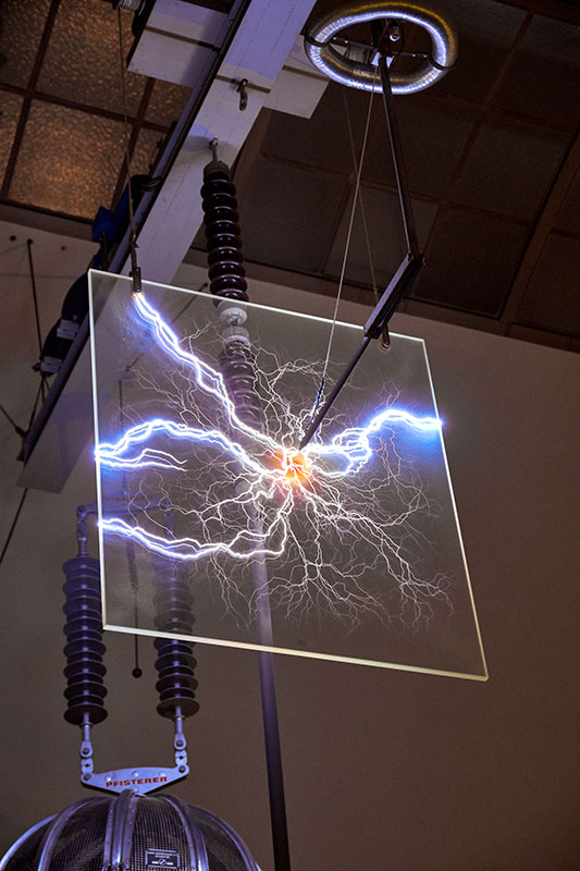 Nicht weniger spannend, nur deutlich lauter erlebten die Schülerinnen und Schüler die Vorführung der Hochspannungsphänomene in der Physik. Den effektvollen Versuchen mit Wechselspannung bis zu 300.000 Volt folgten Experimente mit Impulsspannungen, die einen Scheitelwert von fast einer Million Volt in zwei Millionstel Sekunden erreichten und damit Blitzeinschläge bis 1.000 Ampere Entladungsstrom simulieren. Eine Mitarbeiterin des Deutschen Museums stieg sogar in den Faraday'schen Käfig und wurde einem Blitzausschlag ausgesetzt.