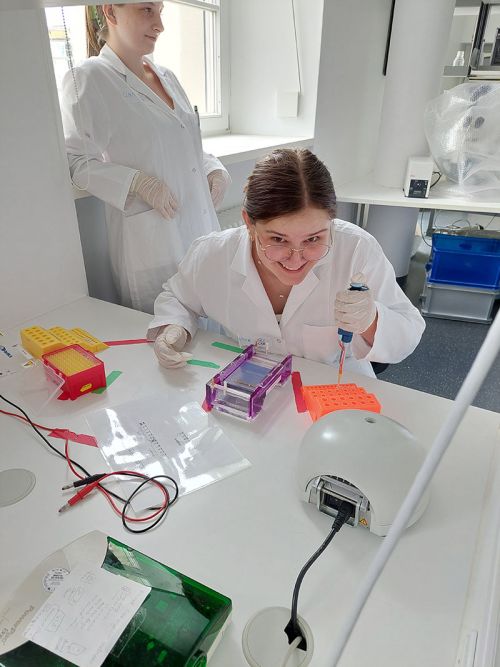 Genetik und Gentechnik sind zwei große Themen in Biologie in der Oberstufe. Der Biologie-Kurs der Q11 hatte jetzt die Gelegenheit, das theoretisch gelernte an einem Tag im Rudolf-Virchow-Zentrum auch in die Praxis umzusetzen. Die Schülerinnen und Schüler klärten mit den Methoden der PCR und Gelelektrophorese einen (fingierten) Mord im Labor auf. Nachdem der Umgang mit den Mikropipetten erklärt und ausreichend geübt war, konnte es - weiterhin im Mikromaßstab - mit der Vervielfältigung und Auftrennung der Proben-DNA losgehen. Ob man alles richtig gemacht hat, oder sich irgendwo in vier Stunden im Labor verpipettiert hat, zeigt sich erst ganz am Schluss. Somit war höchste Konzentration verlangt. Die Wartezeiten, die die Methoden mit sich bringen, wurden mit Diskussionen zu den verschiedenen Aspekten der Genetik und Gentechnik interessant gefüllt. Und – wie von angehenden Genetikern des RGW zu erwarten – konnte die DNA-Probe vom Tatort zweifelsfrei einem der Verdächtigen zugeordnet werden!