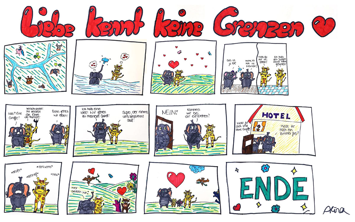 Ein besonders schönes Beispiel dürfen wir hier mit Erlaubnis der Zeichnerin (Alina Roe, ehemalige Schülerin) zeigen – ein Comic mit dem Titel: „Liebe kennt keine Grenzen“.