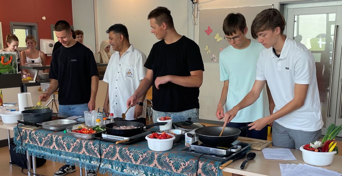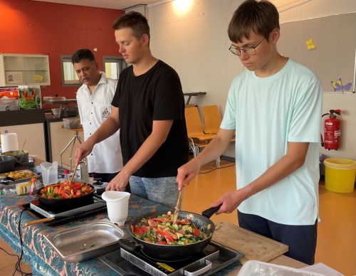 Gemeinsam wurde ein traditionelles Menü vorbereitet. Die Schüler bereiteten in kleinen Grüppchen Blumenkohl-Pakoras als Vorspeise, Hühnchen süß-sauer bzw. Gemüse-Kokos-Curry als Hauptspeise und einen erfrischenden Mangolassi für Zwischendurch oder als Dessert vor. Es wurde fleißig geschnitten, gewürzt, gerührt und probiert. Dann war es endlich soweit und die Nachwuchsköche und -köchinnen durften ihre selbstgekochten indischen Gerichte kosten. Im Anschluss hielt Herr Chaudhry noch einen kurzen Vortrag über einige typisch indische Gewürze und deren Bedeutung für die indische Küche bzw. für unsere Gesundheit.