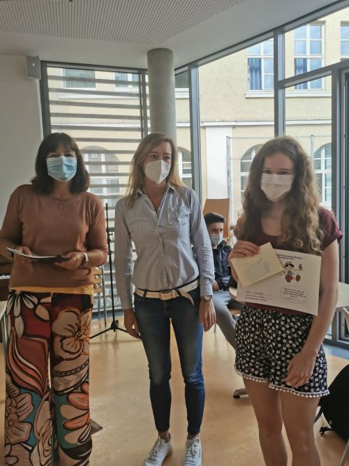 Zu den erfolgreichen Teilnehmern zählten aus den 5. Klassen Maria Spall und Chiara Heidel (beide 5c, Sachpreise) und Cedric Haddad (5b, 1. Preis). Aus der Klasse 7c nahmen Johann Teichert und Emil Giner (3. Preis), David Prodan (2. Preis) und Enrico Schmitt (Sachpreis) erfolgreich teil. Miriam Schnabel (8b) und Gregor K. und Soma K. Szabo (beide 8b im Team) erhielten einen Sachpreis bzw. 1. Preis. Miriam und Gregor bekamen zusätzlich einen Buchpreis für die regelmäßige und erfolgreiche Teilnahme am jährlichen Wettbewerb seit der 5. Klasse.